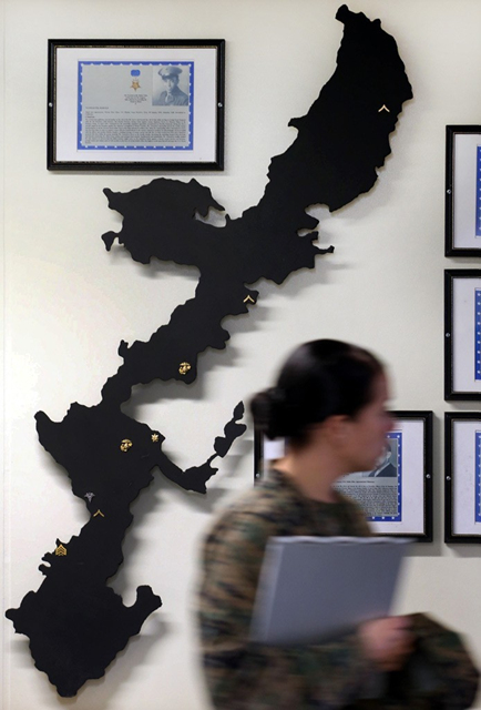 现年34岁的多拉夫顿曾被派往伊拉克,是一位很有经验的海军陆战队队员,他表示“海军陆战队时刻保持保卫日本的使命感来到了冲绳”。另一位24岁的队员霍华德则心情复杂,表示“日本是我非常喜欢的国家,虽然很想与当地人进行交流,但我们始终存在无法理解的东西,非常遗憾”。图为美军士兵参加日本文化与冲绳历史讲座。