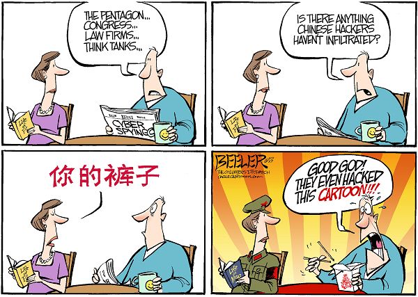 不得不佩服美国人的幽默,这组漫画思维跳跃性比较强,但反映的是美国人心中对中国威胁的恐惧。