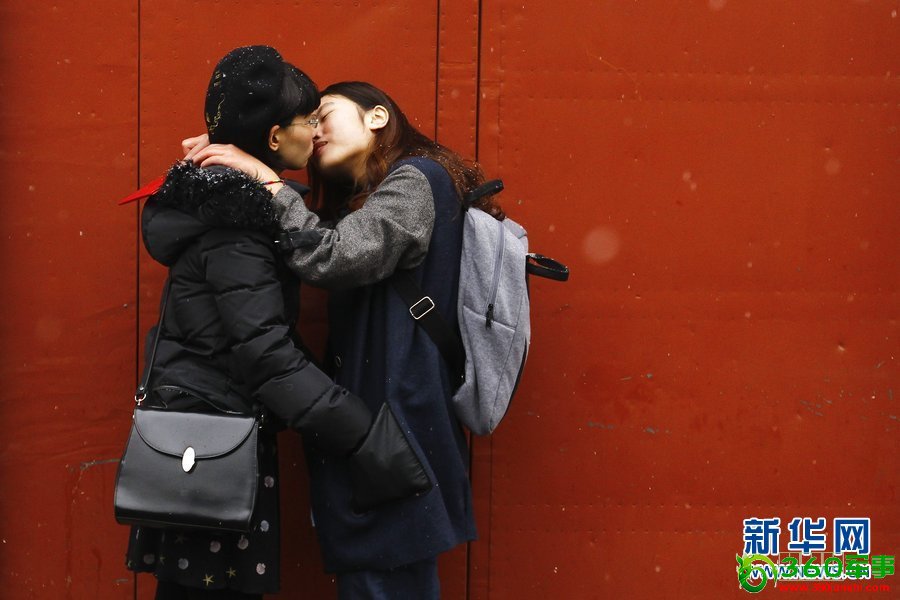 二人在进入婚姻登记处前相互爱抚。