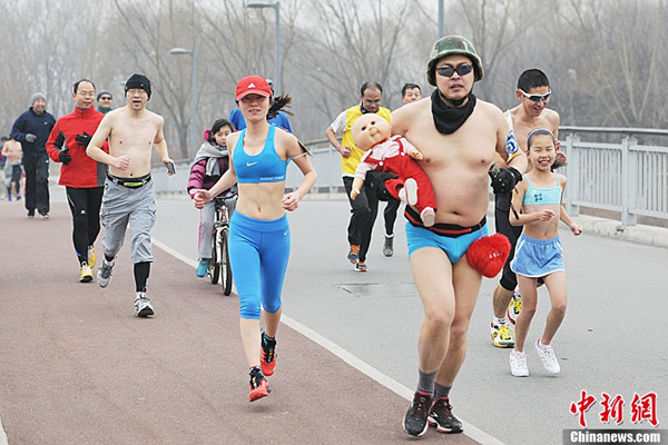 2月24日,跑步爱好者们齐聚北京奥林匹克森林公园,参加第二届“光猪跑”活动,“光猪”们只穿内衣(男一件女两件,可佩带其它御寒配件)完成3.5公里长跑的同时,在寒冬中大秀个性造型。