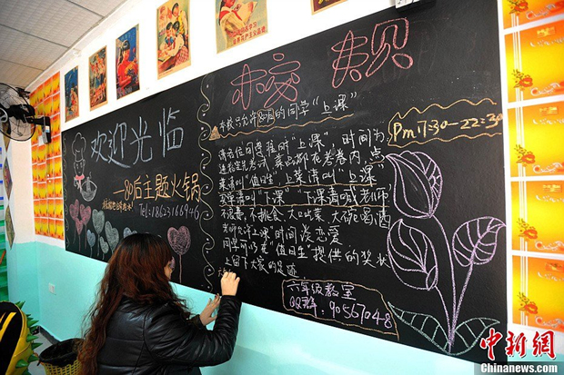 2月21日,重庆一家“80后的课堂”创意火锅店,店里工作人员正在办黑板报。