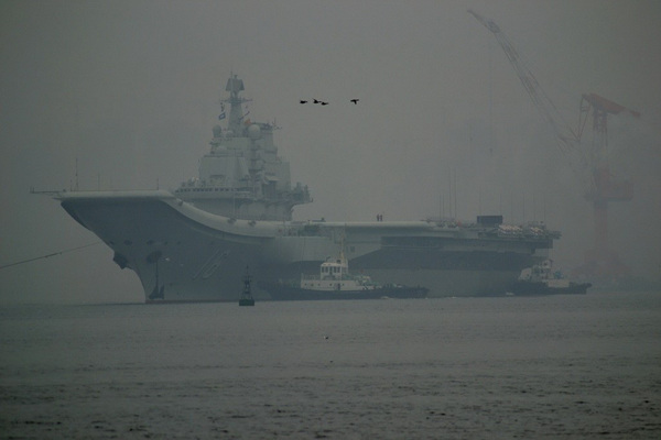 2月26日9点半左右,大连港口大雾弥漫,中国首艘航母“辽宁舰”离开港口。据悉,这次航母将要去往青岛胶东航母基地。图为“辽宁舰”离开港口。