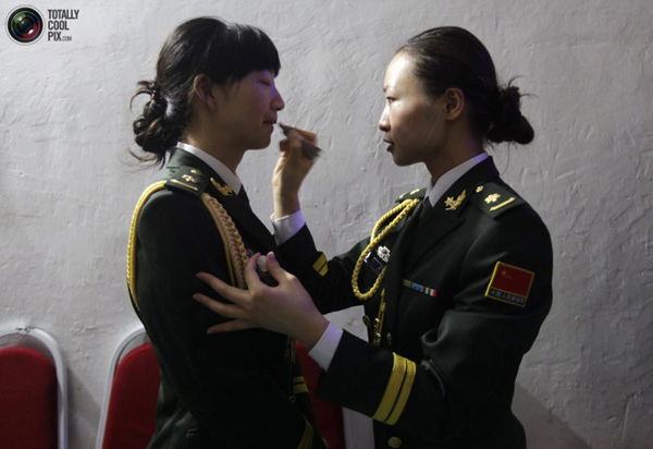 中国女兵正在帮战友补妆。