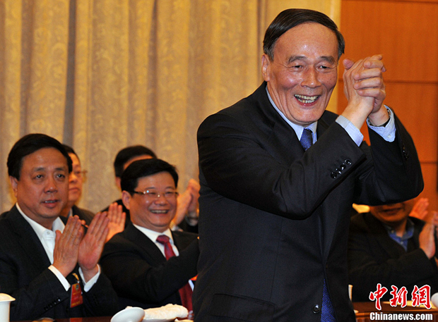 3月4日下午,中共中央政治局常委、中共中央纪律检查委员会书记王岐山看望出席全国政协十二届一次会议的农工、九三界委员并参加联组讨论。他表示保持惩治腐败的高压态势,既要打“老虎”,又要拍“苍蝇”。图为他握拳感谢委员关注反腐问题。